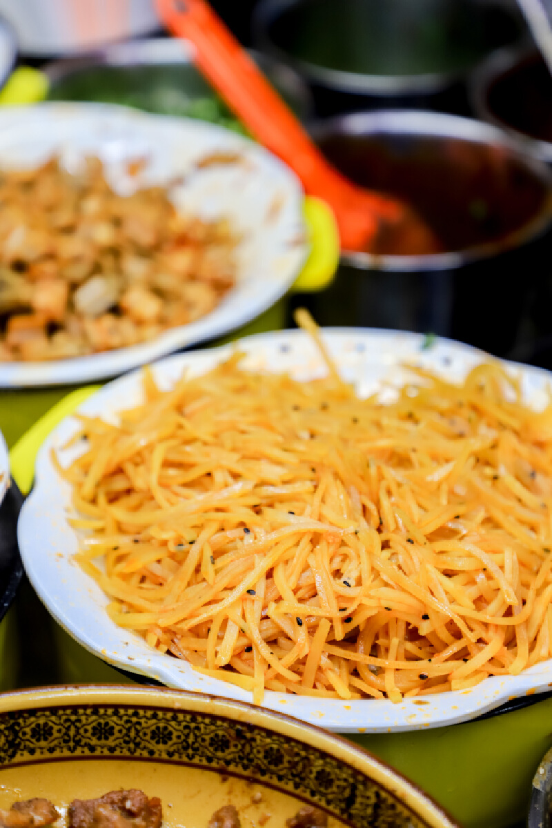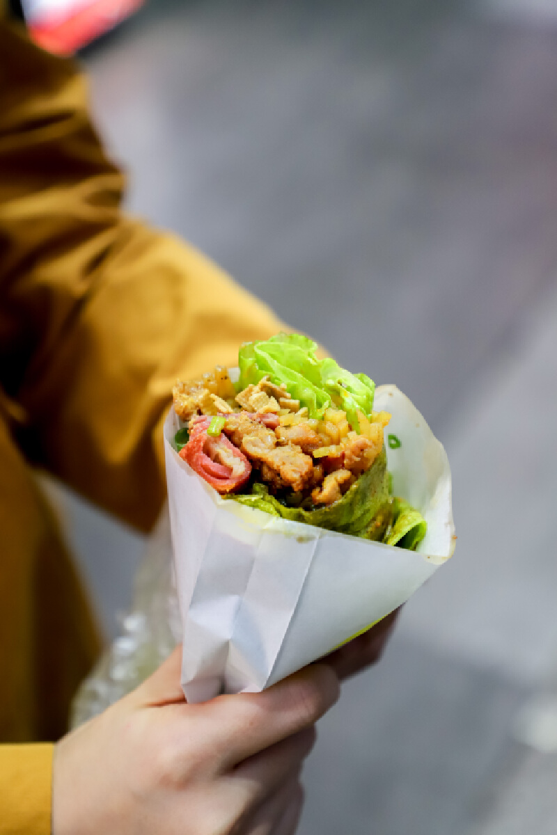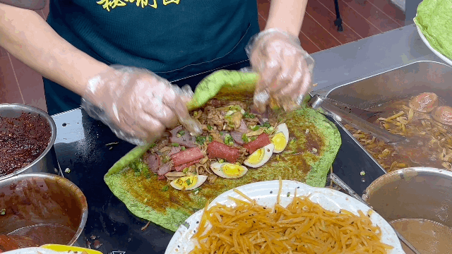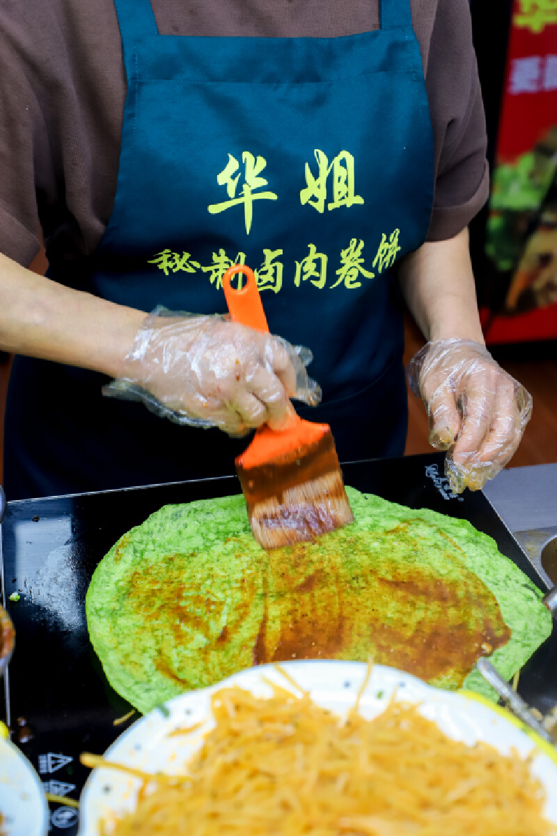 菠菜汁制成的绿色饼皮内包裹着土豆丝和莲藕丁,非常爽脆入味,加入灵魂卤肉和卤蛋,配上华姐家秘制的酱料,就是这个味儿!