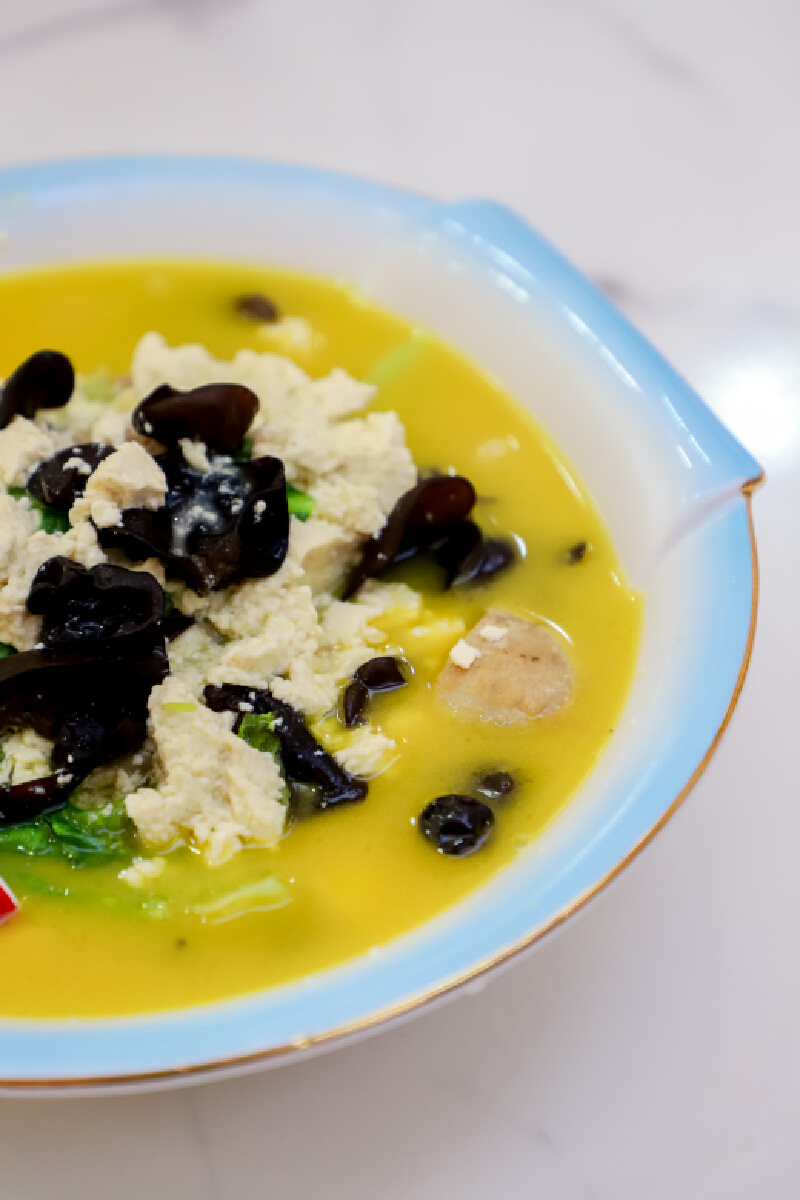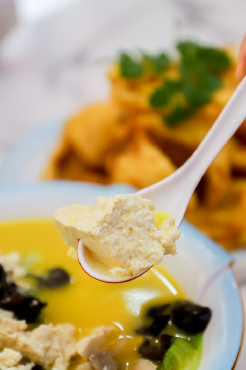 店里的鸡汤豆腐也深受食客的喜爱。金黄色的鸡汤醇厚不油腻,吸收了鸡汤精华的豆腐变得更加鲜美。