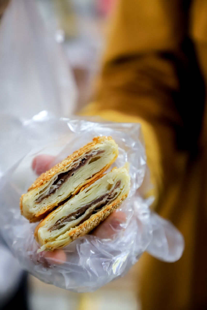 饼的层次多,每层都蓬松,边缘处焦脆,越往中心越软嫩。豆沙馅薄薄的,甜而不腻。