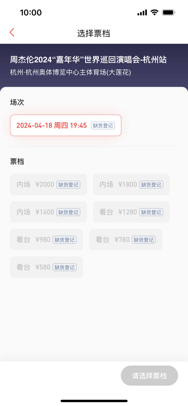 2024年2月2日,周杰伦杭州演唱会的四场门票已经预售。当时售票平台是大麦网、猫眼娱乐、票星球。根据主办方的规定,每笔订单最多购买2张门票且单个ID 账号限购2张,一个观演人证件只支持购买一张同场次演出门票。据媒体报道,2月2日抢票当天,开票后5秒钟还没到,三个票务App,4月18日所有档位的票,均已显示缺货登记。