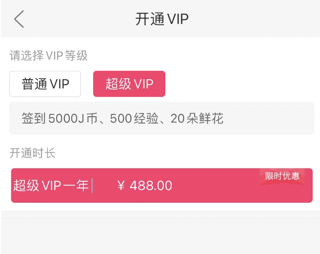 记者登录JayMe App发现,VIP共有两档,普通VIP为48元一个月,而超级VIP仅按年费购买,为488元一年。
