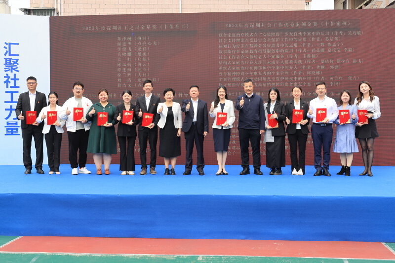 活动现场,市委社工部的领导为在深圳社工行业评选表扬活动中获得2023年度“十佳”社工、“十佳”督导、“十佳”优秀案例、“十佳”典范项目的社工代表颁发了荣誉证书。最后,市委社工部、市委组织部、市委宣传部、龙华区委区政府等部门的领导共同启动了本届社会工作宣传周活动。
