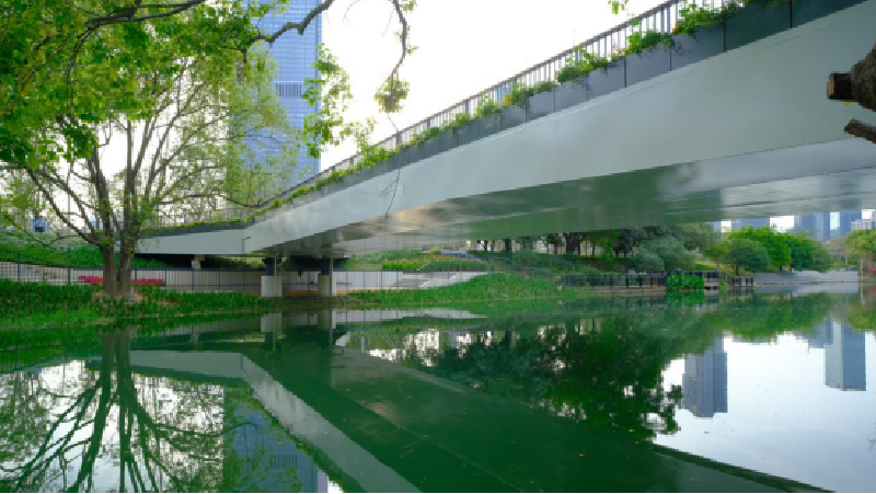 福田河园桥位于笔架山公园与笔架山体育公园之间,处于“五园连通”的重要一环。该地段连接了莲花山公园、深圳中心公园、银湖山郊野公园等园区,扮演着自然和城市交融的枢纽节点的关键角色。项目包括一座跨河桥和一座水中汀步,市民们沿深业上城天桥来到体育公园,可直接通过园桥到达双砚湖,在感受流水潺潺同时感受湖中野鸭的憨态可掬,体验可及可达的共享绿色空间。汀步则作为台阶的延伸连通两岸,便于市民行走游玩,享受行走与视觉双重体验。