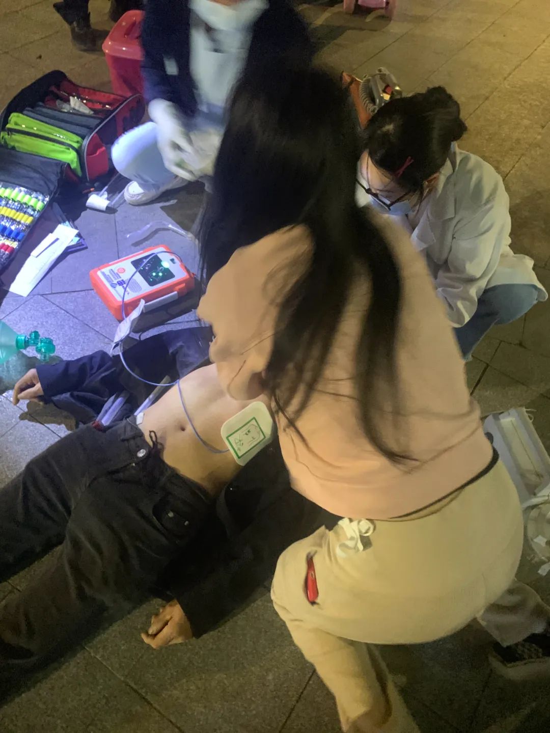21:11,热心市民找到附近的AED,护士出身、已怀孕5个多月的陈静红先后用AED除颤3次。