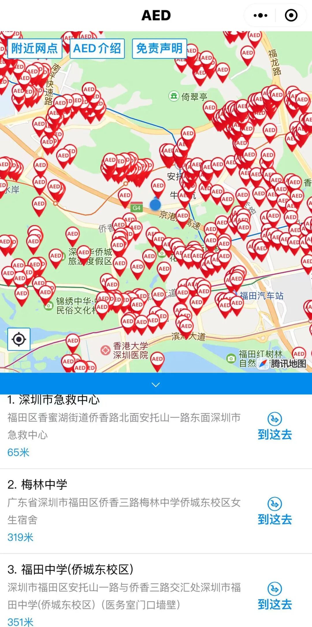 路径二:打开“腾讯地图”或者微信小程序,在搜索栏中输入“AED导航”就会显示离你最近的几台AED,根据导航提示即可前往取出。