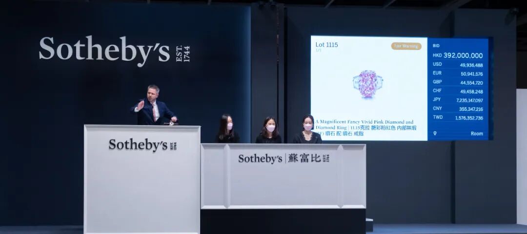 此次拍卖会的领衔瑰宝是一件名为“The Pink Supreme”的粉钻戒指,以约8388万港币(约合人民币7720万)的高价成交。