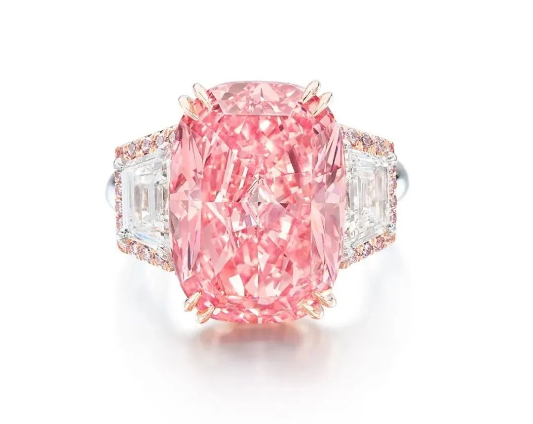 这枚钻石重达15.48克拉,是拍卖史上最硕大的内部无瑕浓彩粉红钻石。主石呈现出醉人的浓彩粉红色调,为极少数经美国宝石研究院(GIA)鉴定属Type IIa级别的粉红钻石,而全球少于2%的宝石级钻石属于此类别。