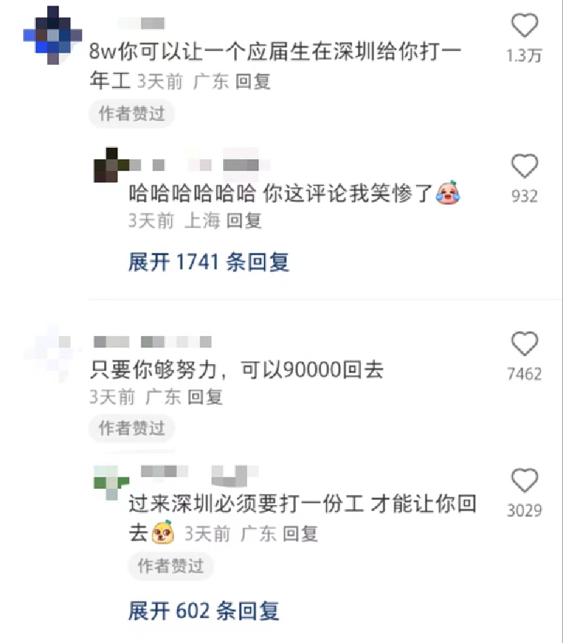 网友评论:8万可以让一个应届生在深圳给你打一年工;还有网友评论:只要你够努力,可以9万回去。