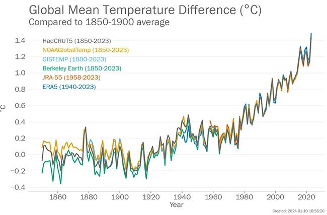 △2023年全球温度综合数据集。图片来源:WMO官网