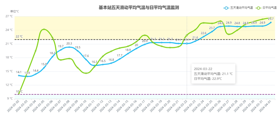 根据深圳福田国家基本气象站监测数据,深圳3月20-24日五天滑动平均气温为22.6℃,且经过观察,后续的“五天滑动平均气温”再低于22℃的概率相对较小,五天中首个日平均气温>22℃为3月22日(22.9℃),即深圳于2024年3月22日入夏,较常年平均入夏日(4月20日)偏早29天。