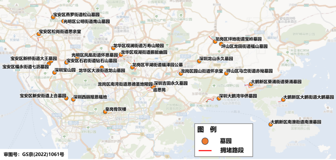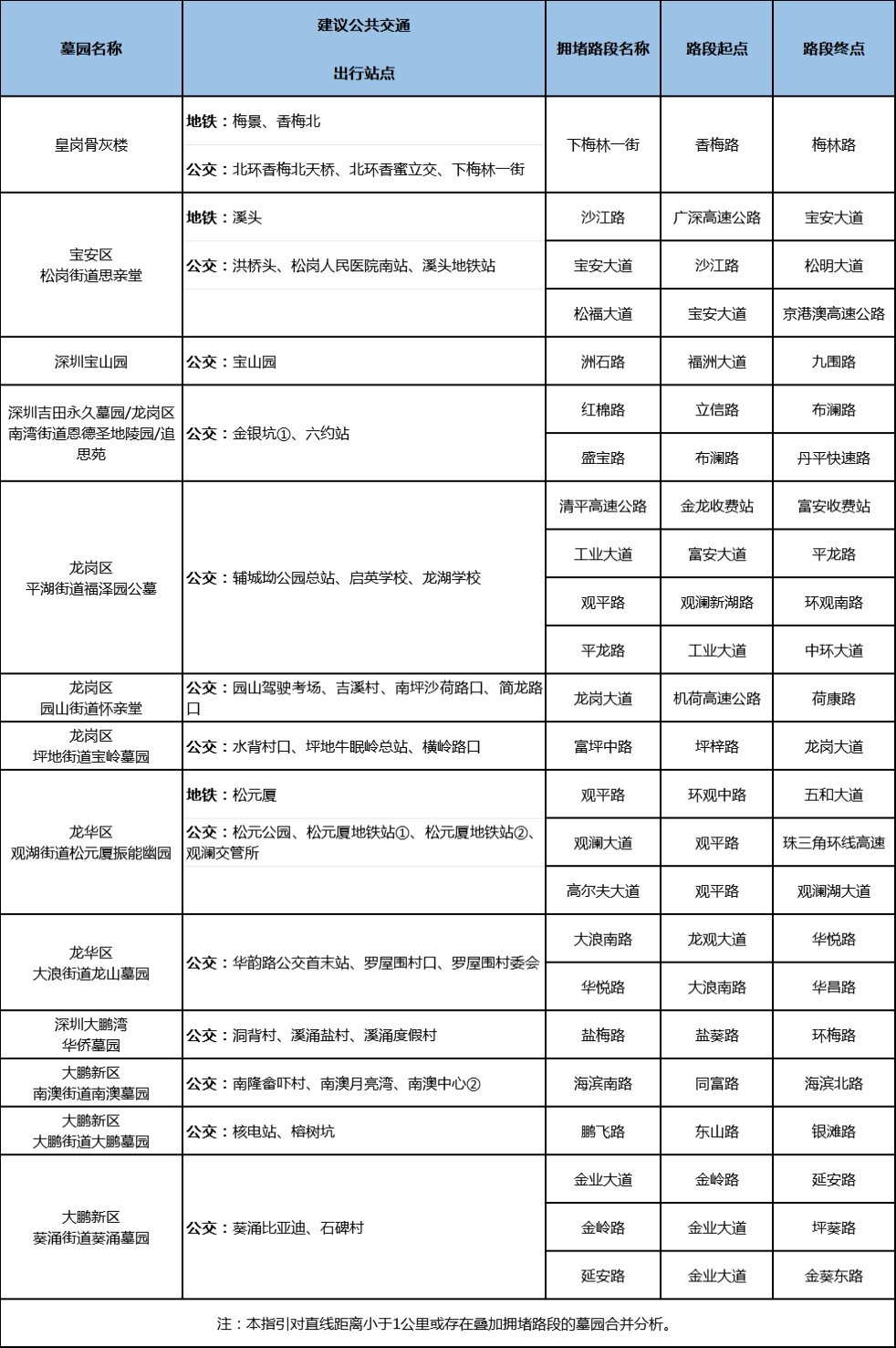 ▲清明假期市内主要墓园周边拥堵路段预测及公共交通出行指引