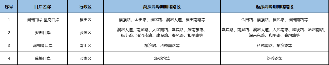 出行高峰期期间,预计福田口岸、皇岗口岸、罗湖口岸、深圳湾口岸、莲塘口岸周边福强路、金田路、滨河大道、南湖路、东滨路、科苑南路、新秀路等通行压力较大。