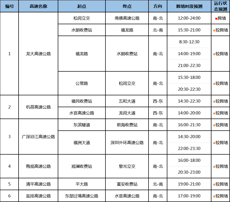 其中,龙大高速(松岗立交-莞佛高速公路)、机荷高速公路(福民收费站-五和大道)、广深沿江高速公路(东滨隧道-前海收费站)等部分路段较为拥堵。