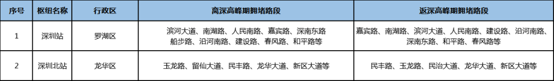 出行高峰期期间,预计深圳北站周边拥堵路段包括玉龙路、留仙大道、民丰路、民治大道等,深圳站周边拥堵路段包括滨河大道、南湖路、嘉宾路、人民南路等。