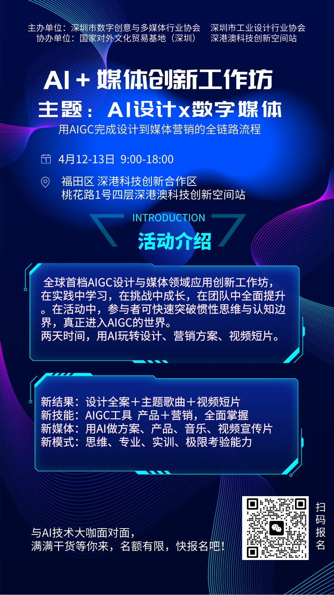 由深圳市数字创意与多媒体行业协会、深圳市工业设计行业协会主办,国家对外文化贸易基地(深圳)、深港澳科技创新空间站协办的AI+媒体创新工作坊,将于2024年4月12-13日9:00-18:00,在福田区深港科技创新合作园桃花路1号四层深港澳科技创新空间站举办。