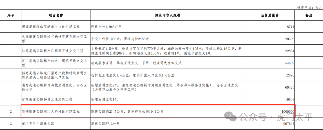 今年3月24日,广东省发展改革委下达了《广东省2024年重点建设项目计划》,莞佛高速公路虎门大桥段改扩建工程被列入广东省2024年重点建设前期预备项目计划表。计划表显示,虎门大桥改扩建工程长约21.5公里,其中桥梁长约19.4公里,总投资100亿元。