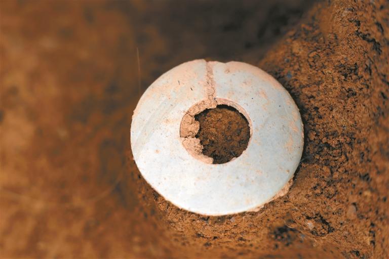 彼时,深圳考古队的成员们正顶着烈日,蹲在古墓里,拿着竹签,一点点往外剔土。“你们来得真是时候,又有新发现!”深圳考古队现场负责人朱汝田兴奋地说。原来,当下白田山遗址已进入收尾阶段,正在“打隔梁”。而就在“打隔梁”的过程中,又发现了4座新墓葬。与此同时,正在清理中的墓葬亦有惊喜。玉锛、石戈……编号为M35的墓坑里随葬品如同开盲盒一般,不断爆出“隐藏款”。“你看,这个玉锛已经钙化。”杨荣昌从墓坑里拿起一块覆满黄土、精致小巧的玉锛对记者说。穿越数千年的时光,经由考古工作者的发掘,它得以重见天日。除了玉石器外,毫无例外还有陶器的存在,一件身着酱黑色釉的折腹豆静静躺在墓坑中。