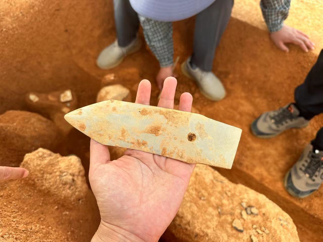 如此丰富的随葬品不免引人遐思尔想,墓主何许人也?杨荣昌告诉记者,墓中既有生活实用器也有礼仪用器,有不少玉制品,初步判断,墓主生前定然“地位不低”。精美的古玉之外,35号墓葬中的石器也非常有特色。漂亮的石玦被打磨得十分纤薄,触之冰凉、莹润光滑,手感极佳。精美的石戈完整无破损,中间厚、两边薄,刃部格外锋利,不输时下的美工刀、裁纸刀。类似这样的古墓,在2号岗上一共有大大小小三十余座。面积仅余一千多平方米的2号岗顶部,墓穴如此密集,令人惊叹。