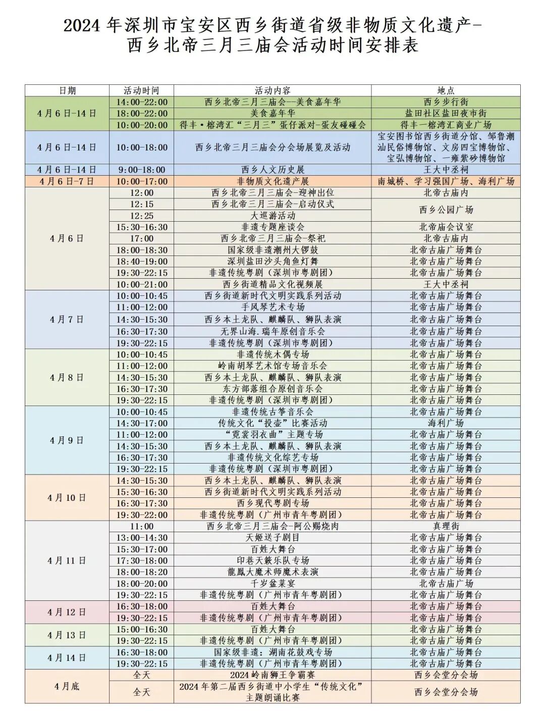 其中,包括西乡人文历史展、2024西乡北帝三月三庙会暨非遗文化节、盐田夜市美食节、2024年西乡街道第二届中小学生“传统文化”主题朗诵大赛、岭南狮王争霸赛、三月三读传统系列活动、“蛋仔派对-电竞嘉年华”主题活动等活动。