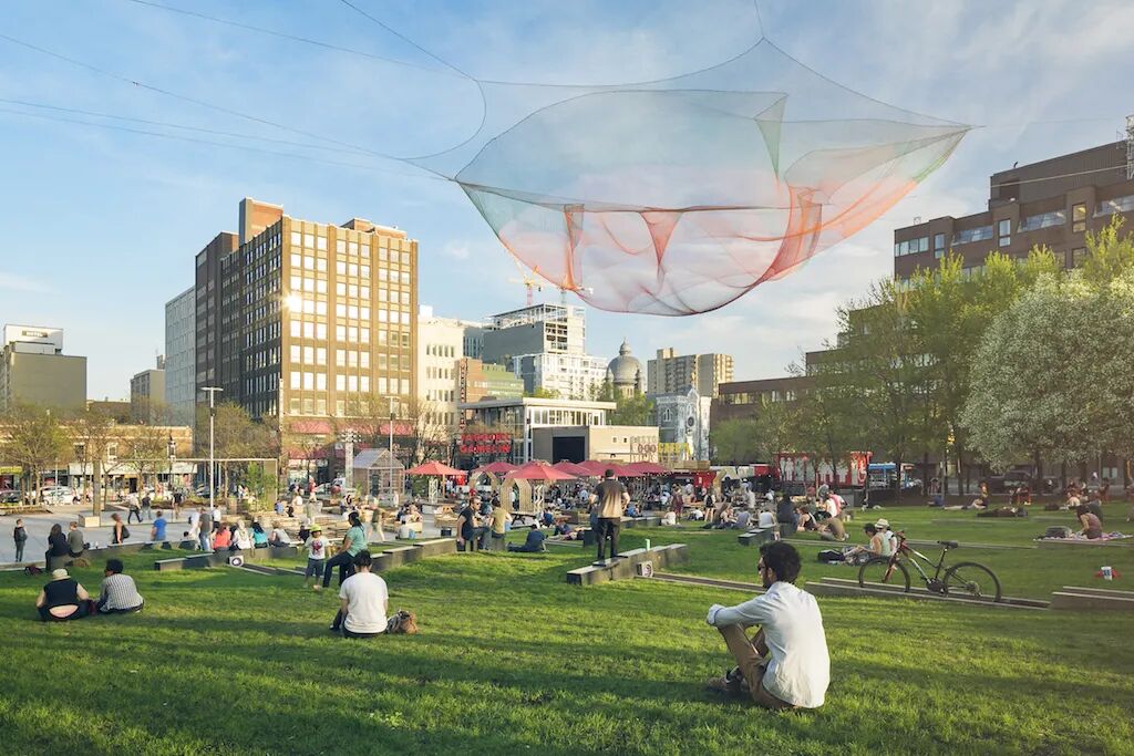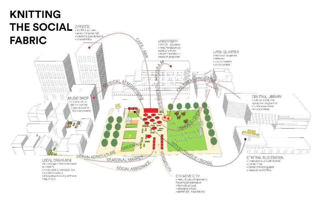 简介:设计方案受到“公共空间项目组织”的启发,整体方案涉及到四个方面:社交层面、用途和活动层面、舒适度和片区形象、准入性和人与人之间的联系。设计方案通过“制地”这—个集体协作的过程,加强了人与场所之间的联系,塑造人们的公共区域,从而让区域的共享价值最大化。此外,项目的设计旨在打造一个人群紧凑的区域,所以每个活动都彼此靠得很近。这个方法有助于在特定区域制造人群密度,为片区带来生命力。以木材作为主要材料给人一种温暖的感觉,顶部是随处可见的植物,打造了一种大自然的氛围,为片区带来自然的生命力。