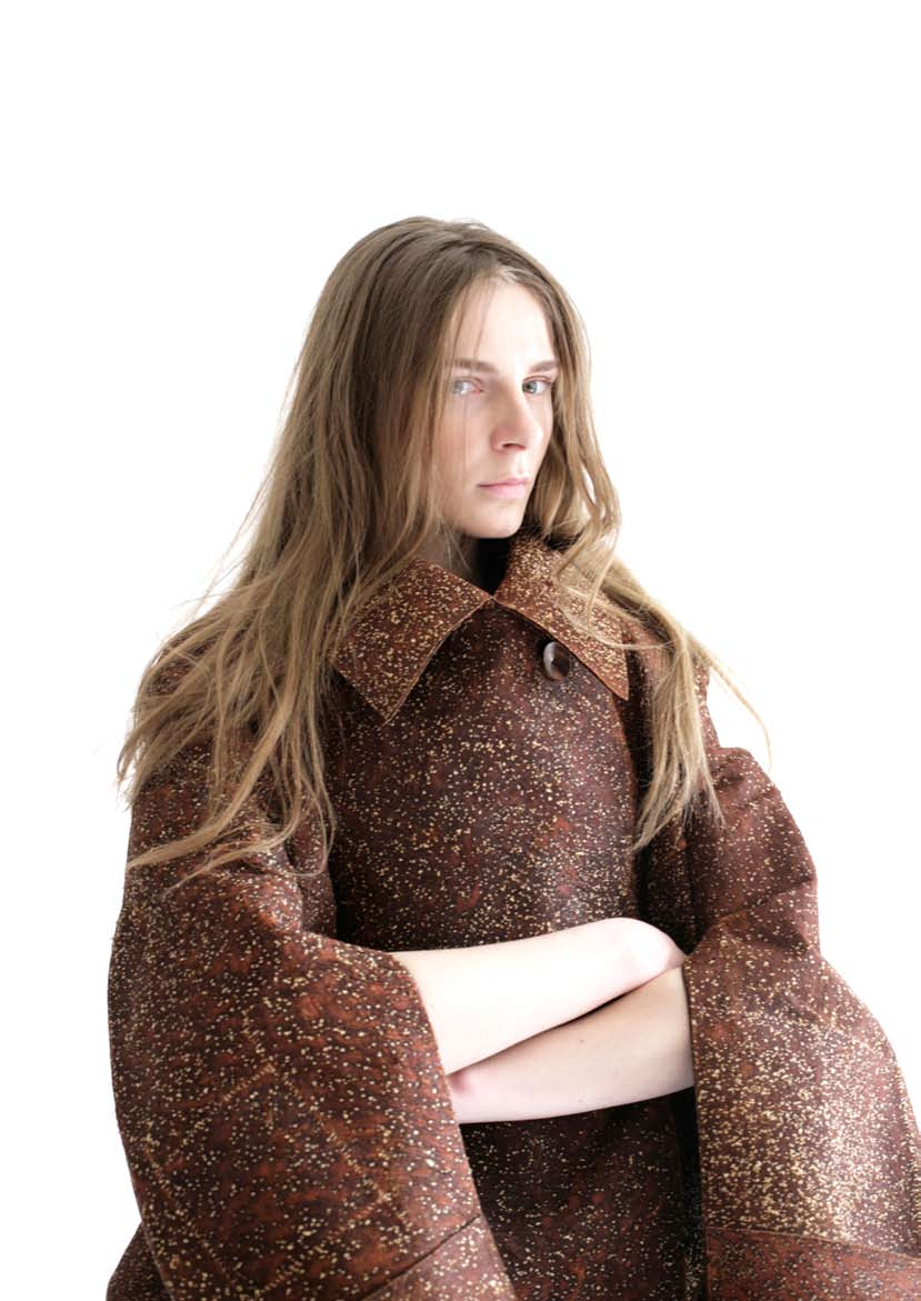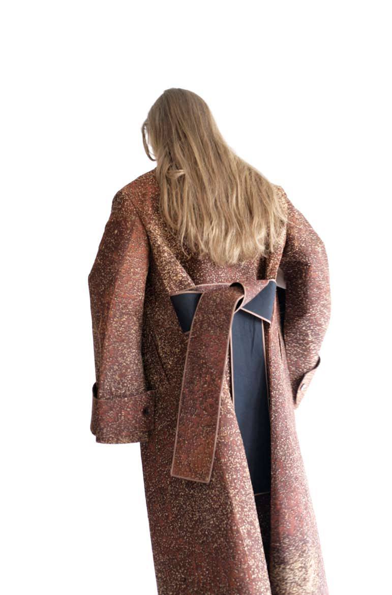 作品简介:这件外套的故事始于作者成长地——乌干达,每九个月,东非无花果树的树皮可以剥去一次,然后再用香蕉叶包裹树,让树皮重新长出。无花果的树皮在大锅中煮熟以使其软化,然后用木槌敲打,便生产出比原始树皮大十倍的纺织品。这种纺织品被称为树皮布,2008被列入联合国教科文组织的非物质文化遗产名录。树皮布的独特之处在于它的独特性:没有两块是完全相同的。