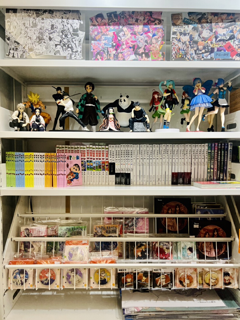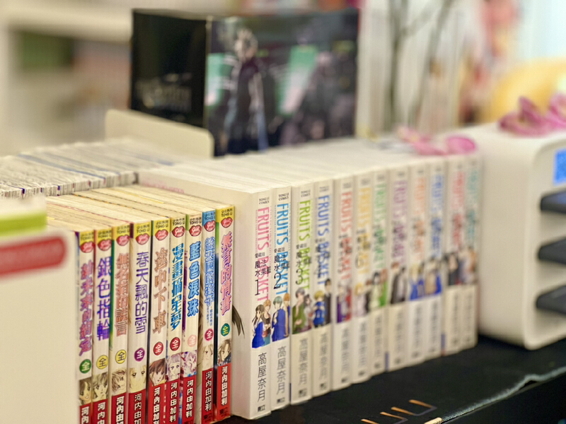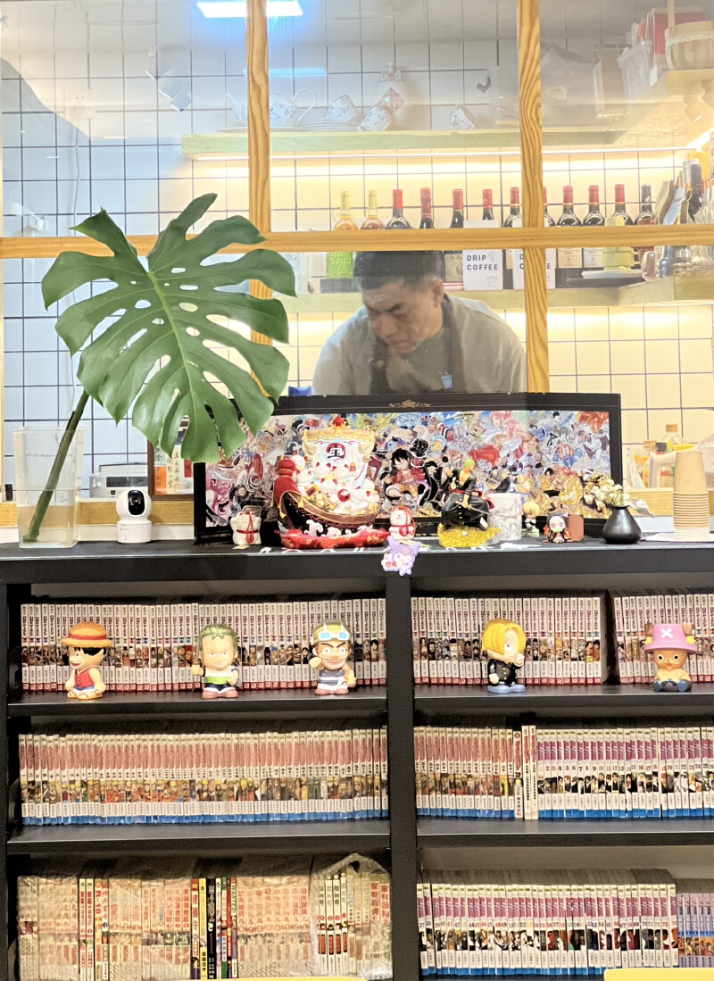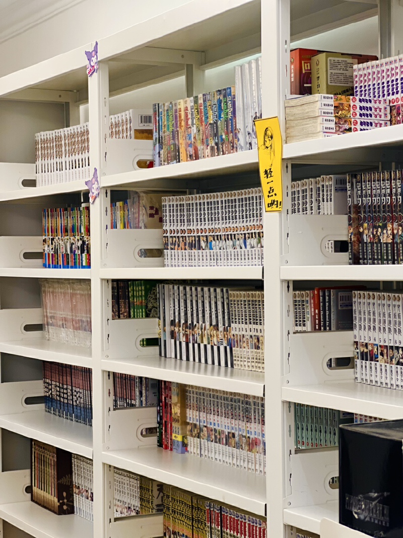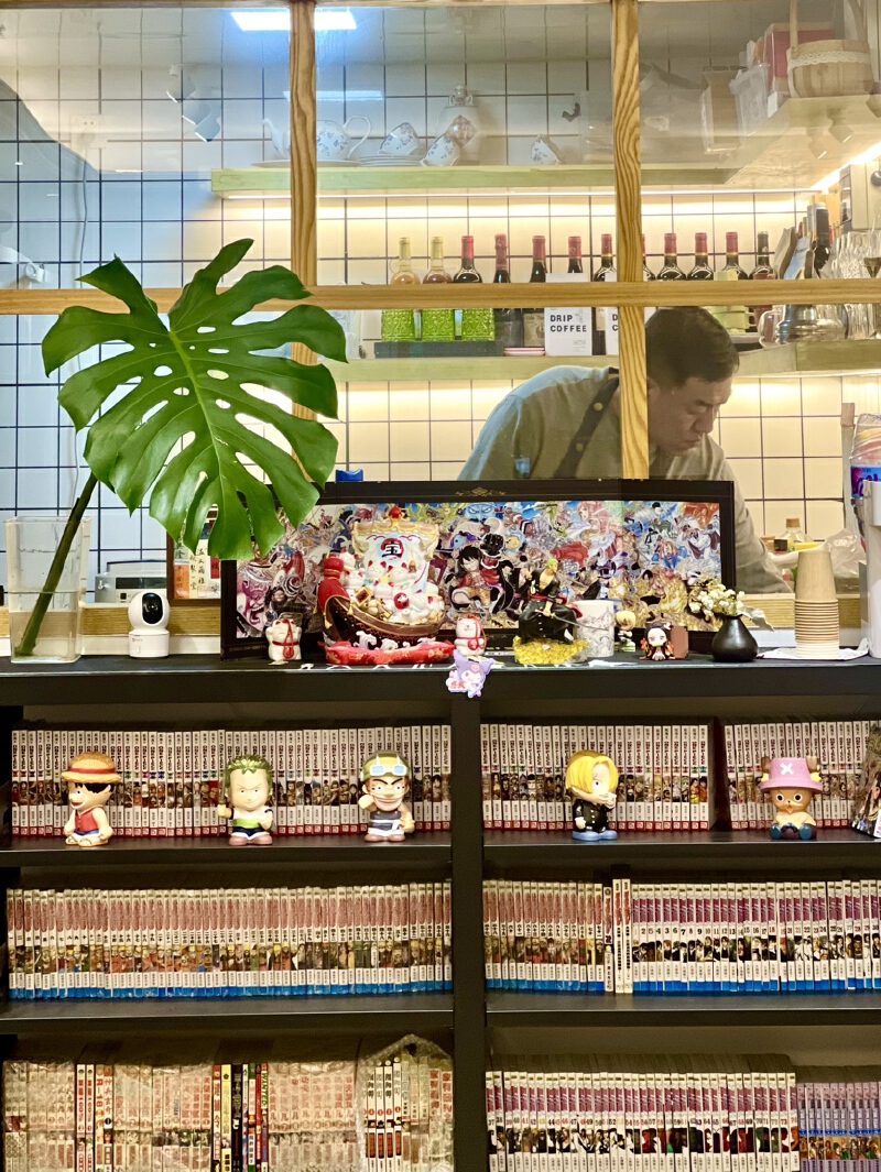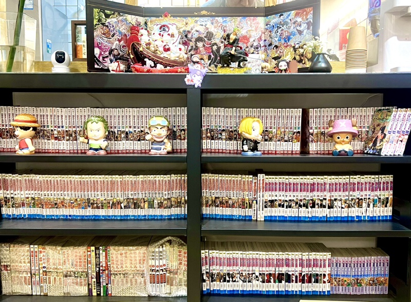 小店面积不大,门口有个漂亮舒适的露台,屋内靠着墙边设置了高低不一的书架。上千本漫画书分门别类整整齐齐地排列在其中,无论是经典的《火影忍者》《海贼王》《银魂》,还是时下正火的《鬼灭之刃》《咒术回战》等,都能找到。
