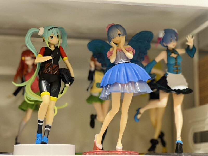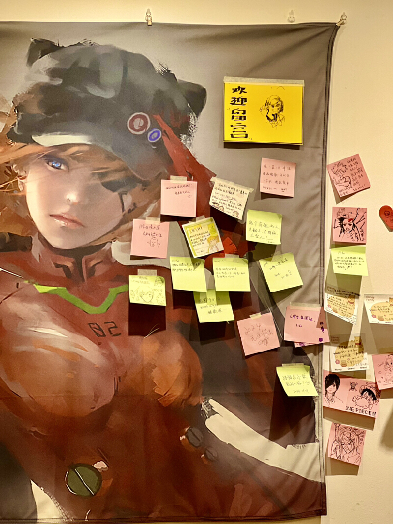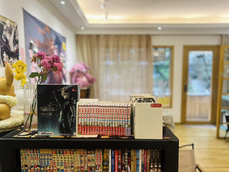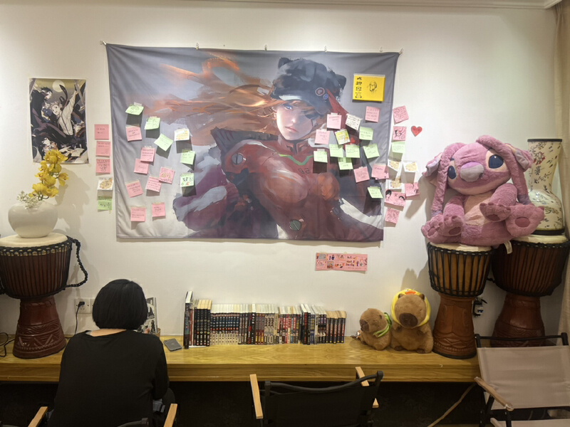 除了漫画书本身之外,屋内的动漫元素也非常鲜明。进门左手边的书架专门留了位置,陈列着少量手办和其他周边产品,墙上贴着动漫海报,墙角站着一整排可爱的毛绒公仔。