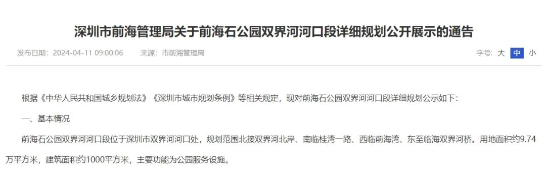 4月11日,深圳市前海深港现代服务业合作区管理局开展《前海石公园双界河河口段详细规划》公示,公开征求意见。规划公示时间为2024年4月11日至5月11日。