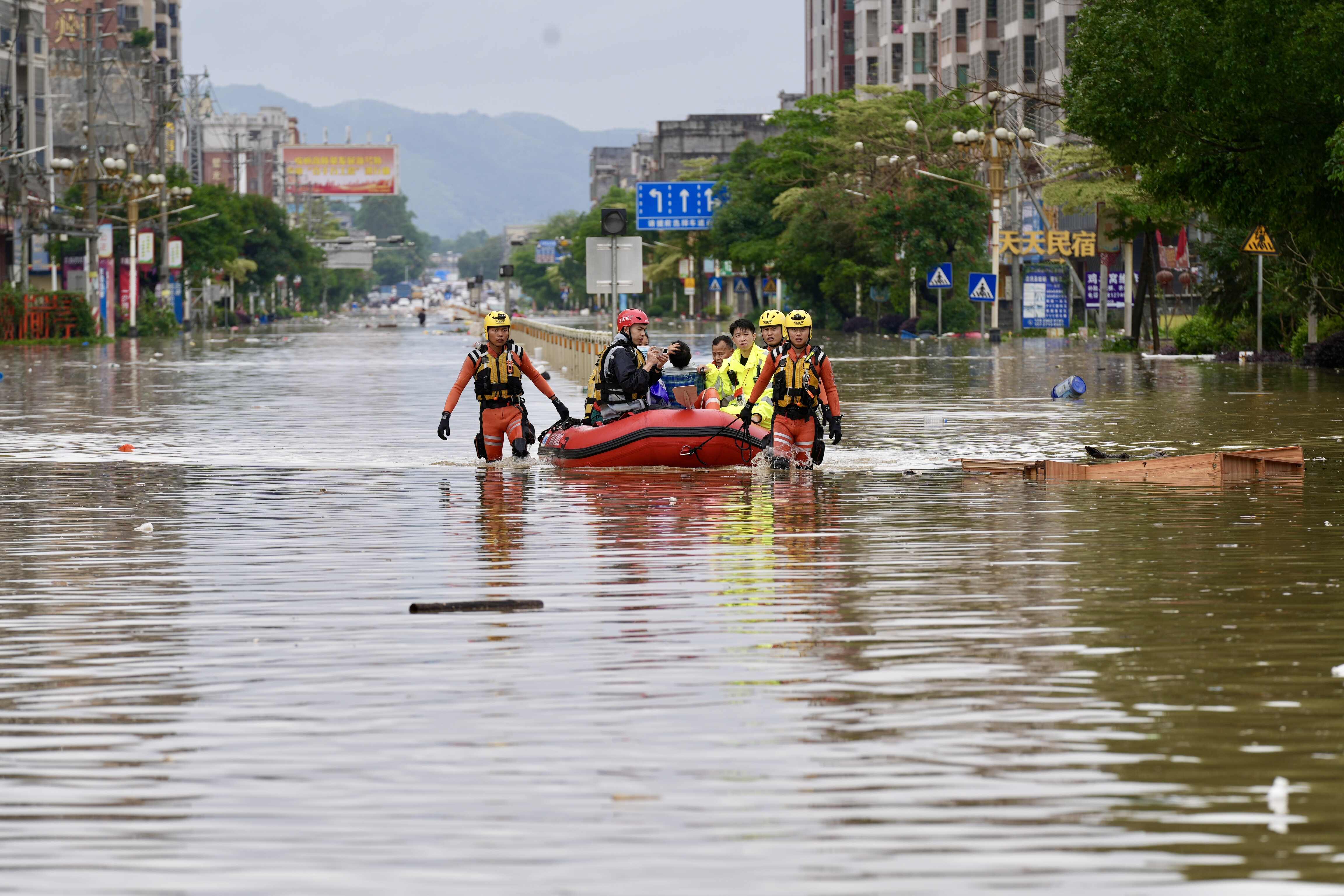 4月21日下午,记者来到英德市浛洸镇。受北江水位上涨影响,该镇大部分沿街房屋的一楼已被水淹没。为转移仍被困在水浸区域的急症患者,消防队员、社区工作者、医护人员等各方力量协同合作,共撑“生命之舟”。