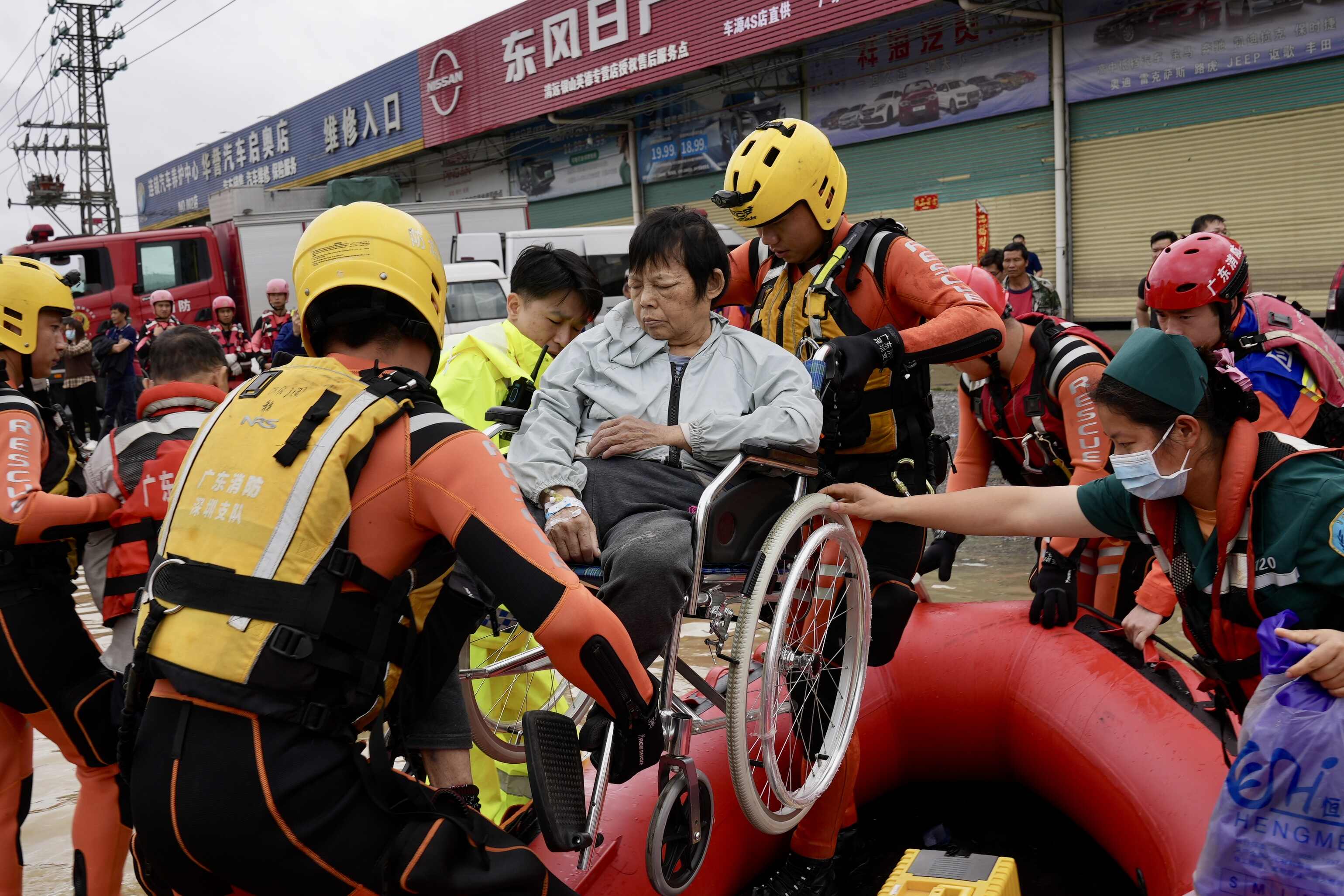 冲锋舟逐渐靠岸,一位坐着轮椅的老人被消防队员抬上岸,胡玲(化名)紧随身后,帮着扶稳轮椅,放平担架,直到看着老人被救护车送走,才放松下来。
