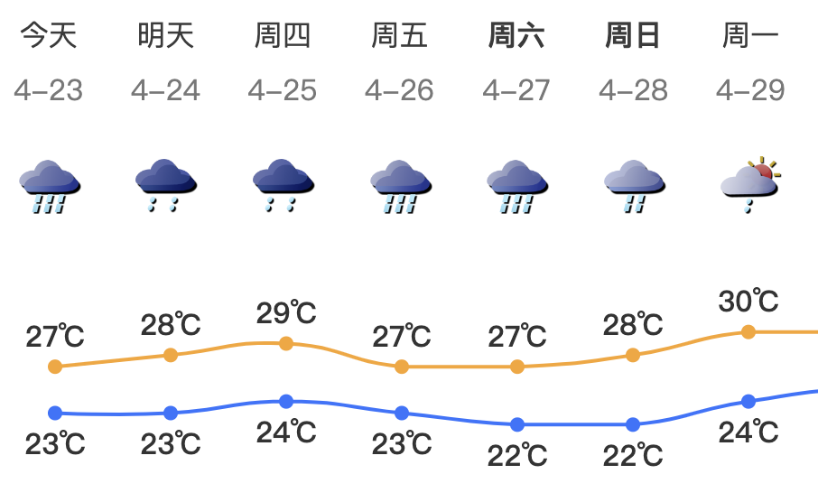 预计23日我市有大雨到暴雨,局部伴有8级左右阵风,气温23-27℃;