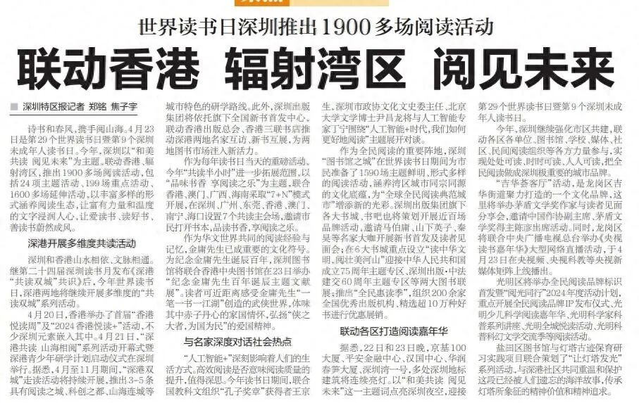 4月20日,香港举办了首届“香港悦读周”及“2024香港悦读+”活动,不少深圳元素嵌入其中。4月21日,“深港共读 山海相阅”系列活动开幕式暨深港青少年研学计划启动仪式在深圳举行。据悉,4月至11月期间,“深港双城”走读活动将持续开展,推出3-5条具有阅读之城、科创之都、山海连城等城市特色的研学路线。此外,深圳出版集团将依托旗下全国新书首发中心,联动香港出版总会、香港三联书店推动深港两地名家互访、新书互展,为两地图书市场注入新活力。