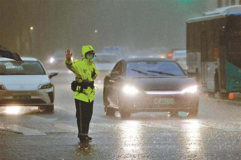 ▲交警在莲花路和新洲路交会处冒雨疏导交通。 深圳晚报记者 陈玉 摄