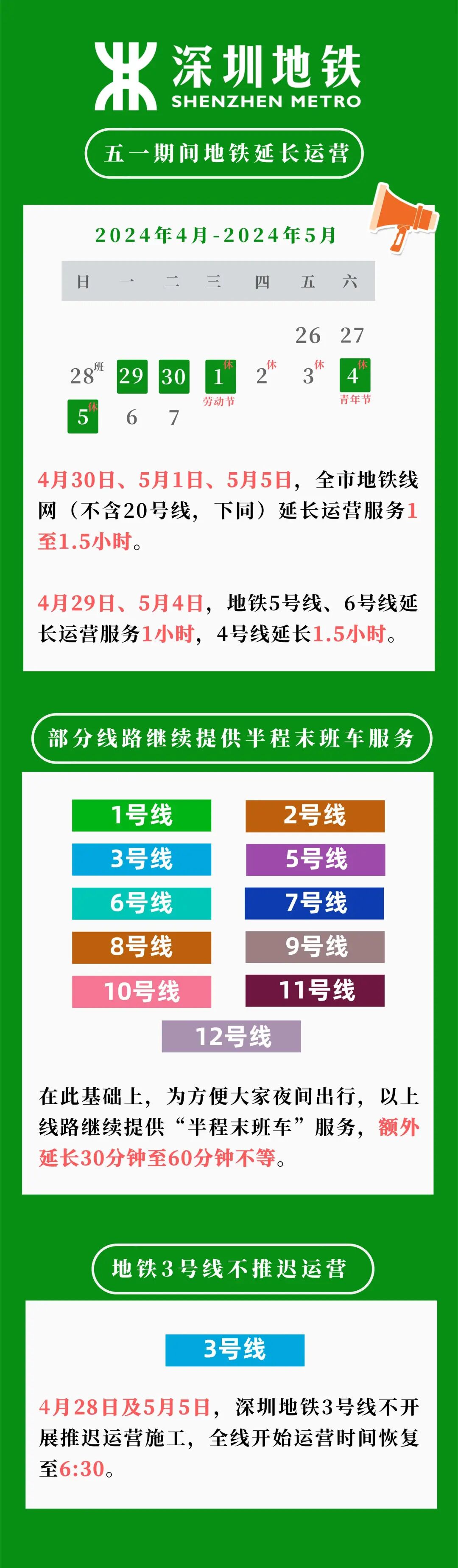 此外,4月28日及5月5日,深圳地铁3号线不开展推迟运营施工,全线开始运营时间恢复至6:30。