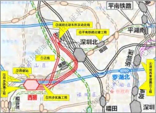 赣深高铁西丽一光明城段正线、西丽站、深圳北动车所及动走线、深圳西站普速搬迁工程、同步实施工程、平南铁路还建工程6个部分。