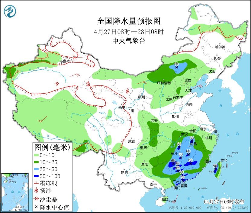 4月27日08时至28日08时,内蒙古中部、河北中部和北部、新疆西部及沿天山地区、西藏东南部、陕西南部、重庆中北部、湖北东部、安徽南部、贵州东南部、湖南中东部、江西、福建、广东大部、广西东北部、台湾岛等地部分地区有中到大雨,其中,内蒙古中部、湖南东部、江西中南部、福建西南部、广东北部和南部沿海、台湾岛西部等地部分地区有暴雨(50~90毫米)。内蒙古大部、甘肃西部、新疆沿天山地区和南疆盆地等地部分地区有4~6级风。新疆东部和南部、青海西北部、宁夏大部、甘肃中西部、内蒙古西部等地有扬沙或浮尘天气,其中新疆东部和南部、内蒙古西部部分地区有沙尘暴或强沙尘暴。