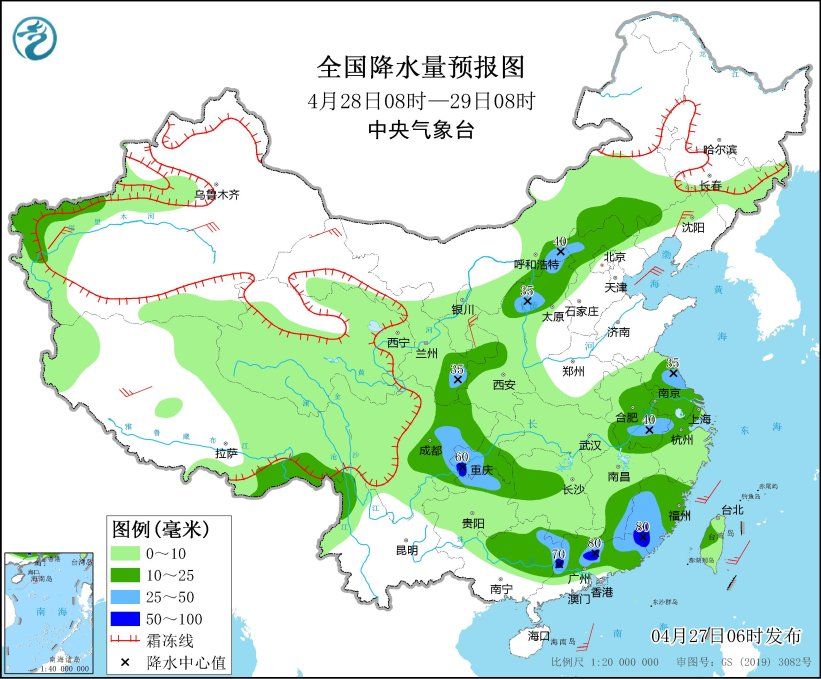 图3 全国降水量预报图(4月27日08时-28日08时)来源:中央气象台网站