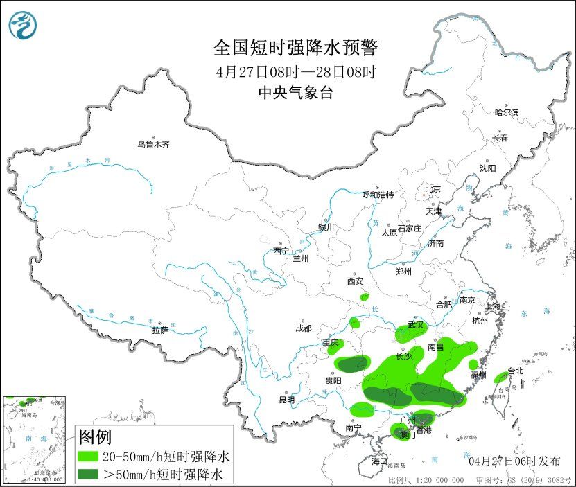 图1 全国短时强降水预警图(4月27日08时-28日08时)来源:中央气象台网站