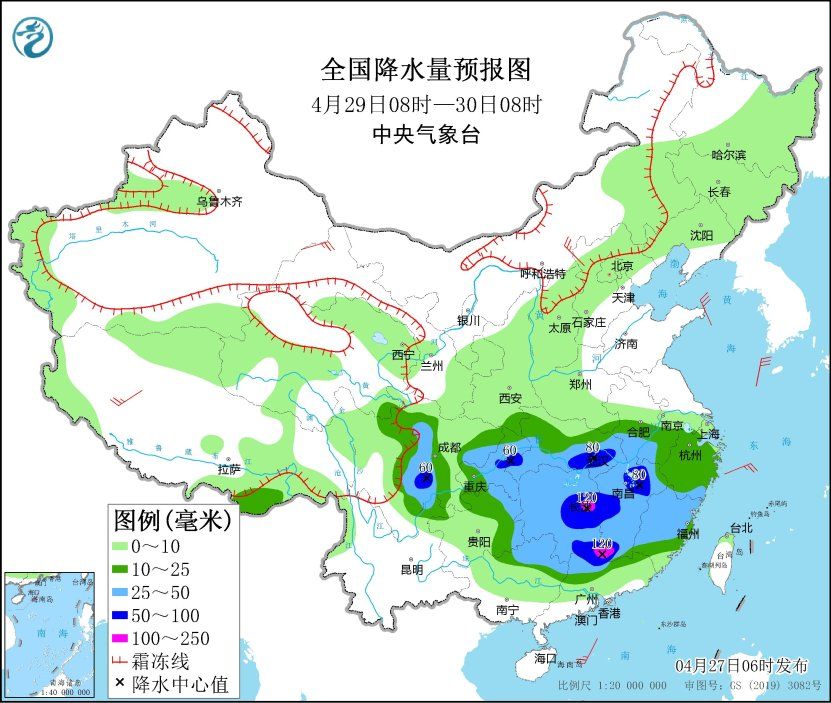 4月29日08时至30日08时,江淮西部、江汉大部、江南大部、四川盆地西部和南部、华南北部及重庆、贵州东部等地部分地区有中到大雨,其中,四川盆地南部、重庆中部、湖北东部、湖南南部和中东部、江西、广东北部等地部分地区有暴雨或大暴雨(100~120毫米)。甘肃西部、河北北部等地部分地区有4~5级风。东海东部、台湾海峡、台湾以东洋面、南海北部和中西部、北部湾将有6~7级、阵风8级的风。
