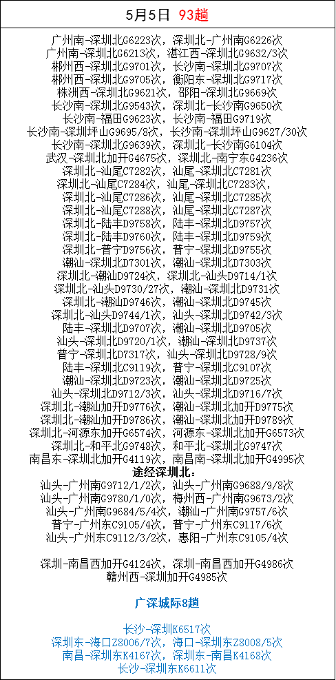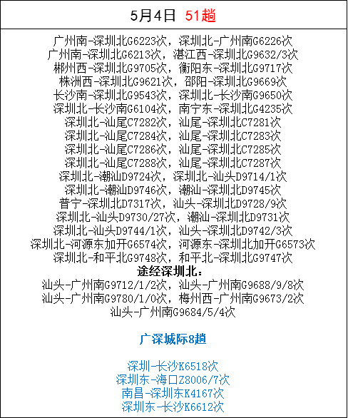 为满足广大市民和旅客朋友的假期出行需求,深圳铁路根据铁路12306候补数据和客流特征,动态、适时加开了广州、汕尾、潮汕、长沙等热门方向的旅客列车,深圳东站还加开了往返海口的直达列车!