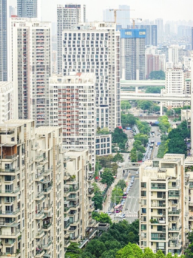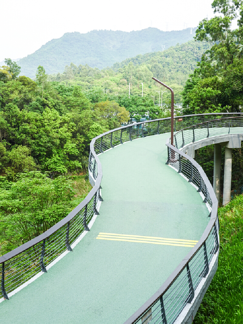 这也是整条绿道中风光格外美丽的一段。迎风远望,高楼大厦矗立在天际线上;车辆川流不息,汇聚成流动的光带;别墅如一颗颗宝石,镶嵌在翠绿山林间,错落有致的样子,写满了故事。