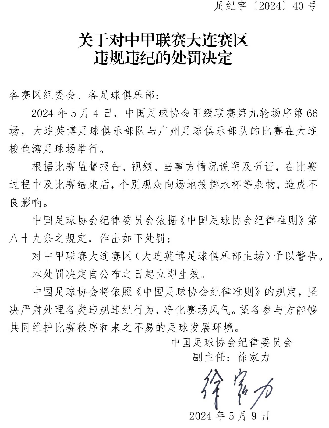 5月10日上午,中国足协在官网发布《情况通报》,对5月4日大连英博与广州队赛后冲突事件进行通报。