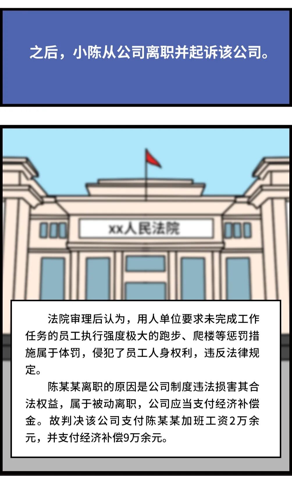 本期案例中,小陈作为某信息服务公司的员工,因未完成公司布置的工作任务,竟被要求按照公司规定完成“跑十公里”、“爬公司大厦”等一系列体罚,否则将被面谈甚至是劝退,这让小陈叫苦不迭。