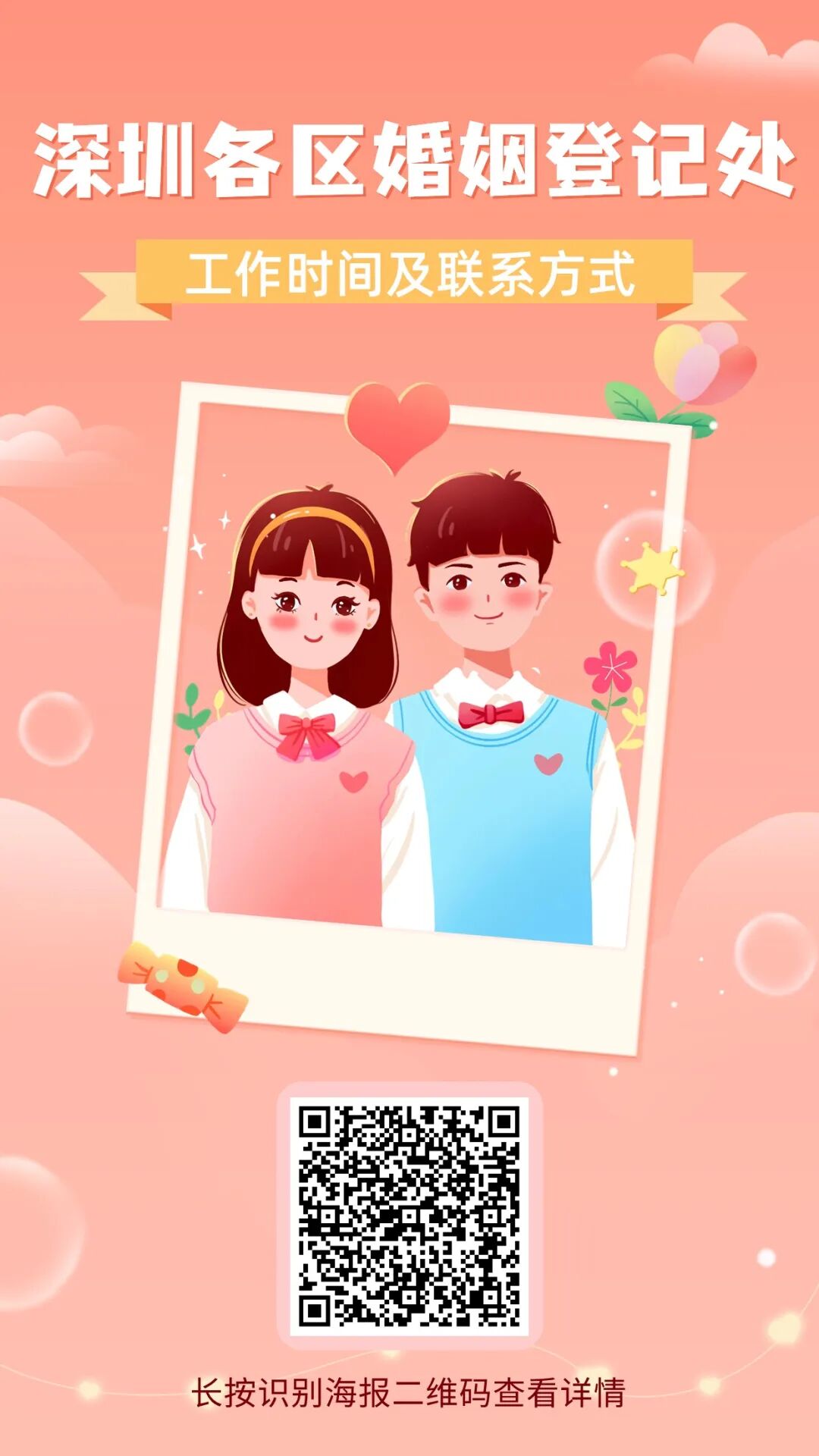为满足新人们办理结婚登记的需求,进一步提升婚姻登记便民、利民服务水平,5月20日,深圳市各区婚姻登记处将全天上班为市民办理结婚登记。