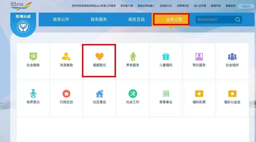 选择“业务之窗—婚姻登记”,进入婚姻登记网上预约系统,开始预约。