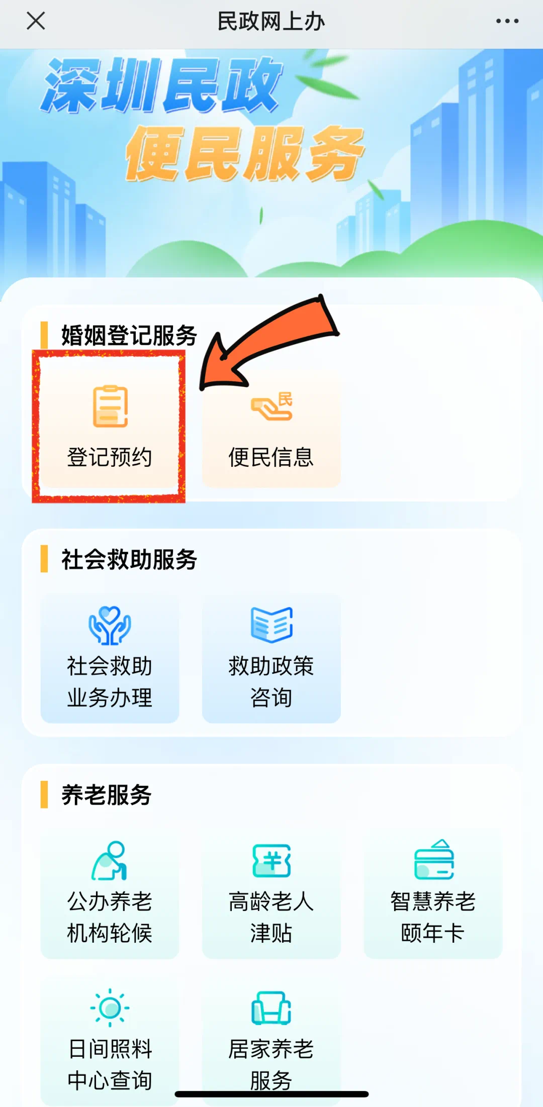 在“深圳民政”微信公众号菜单栏选择“便民服务—婚姻登记服务—登记预约”。