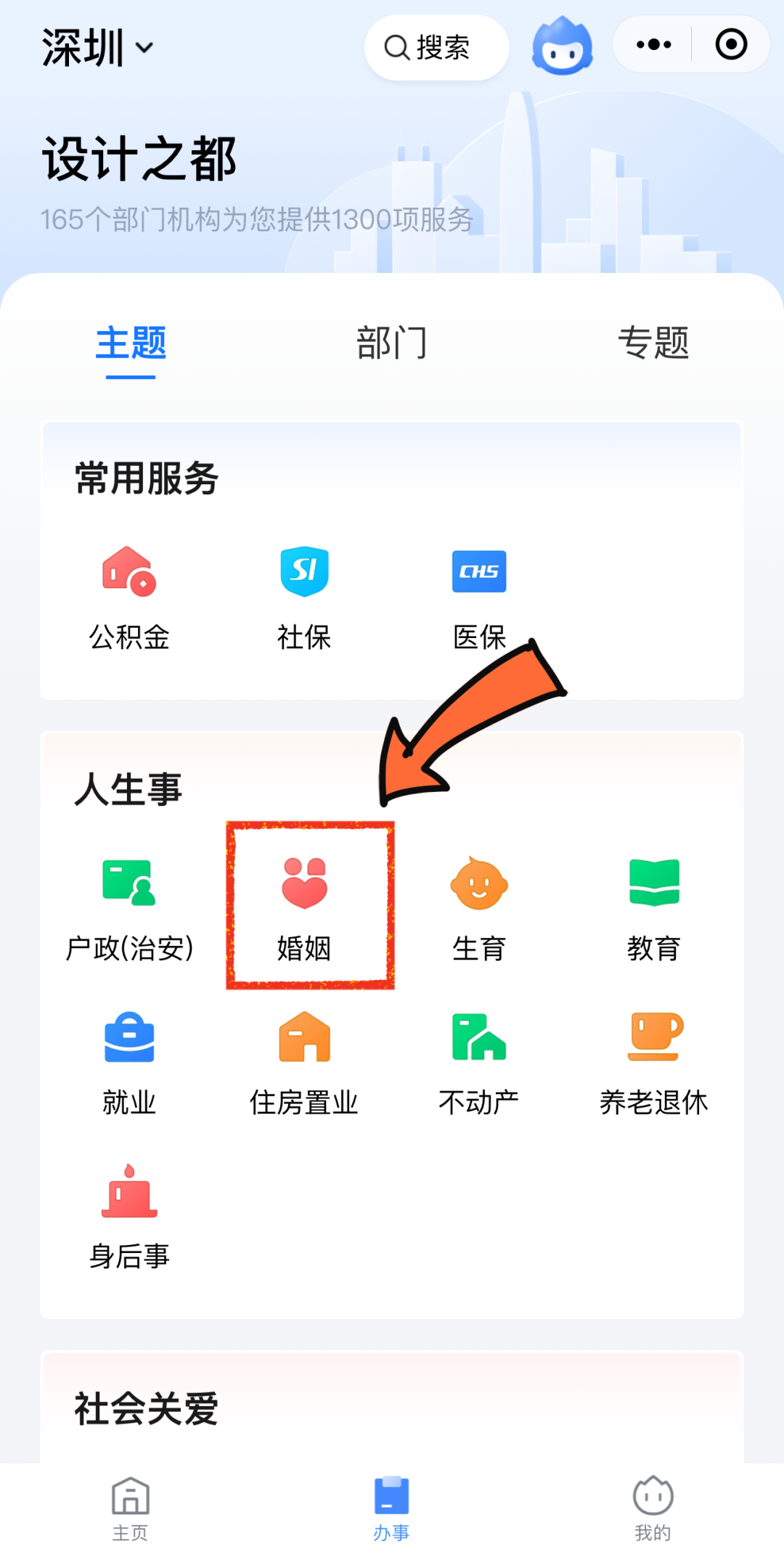 进入“粤省事”小程序,点击菜单栏“办事”,选择“婚姻—结婚登记预约”。