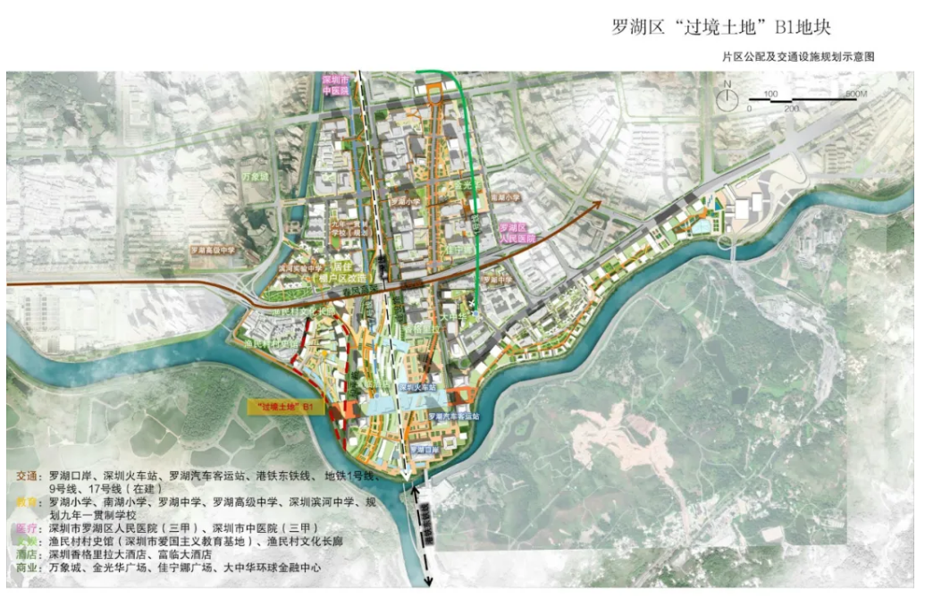 这块宝地拥有无与伦比的区位优势:紧邻深港边界,步行5分钟可达全市深港通关量最大的罗湖口岸,深圳火车站与其比邻,地铁1号线、9号线、17号线(在建)三线交会。