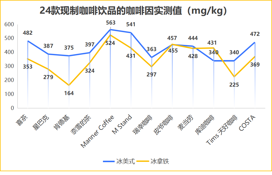 试验的24款样品咖啡因含量在164mg/kg-563mg/kg之间,本次样品中咖啡因含量最高的是MannerCoffee冰美式咖啡,咖啡因含量最低的是肯德基冰拿铁咖啡,前者咖啡因含量是后者的3.4倍。
