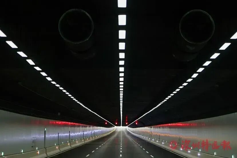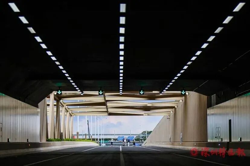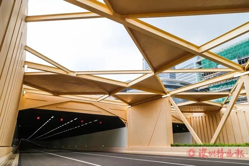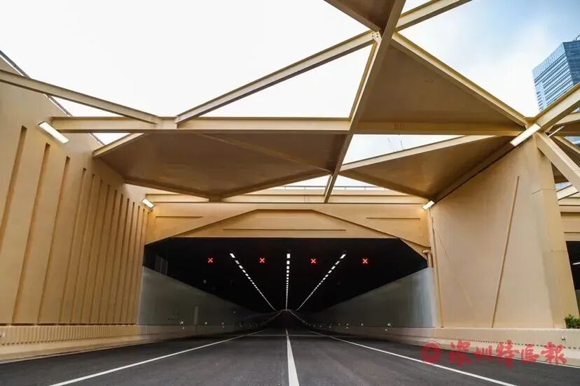 记者现场采访看到,完工后的工程整体建设十分“高大上”。下沉隧道整体采用“消隐式”装修,在隧道内行车时基本看不到管线,呈现出简约大气的风格。隧道出入口采用钢结构框架,顶部镶嵌小块密集的钢结构,装上吸声板,其余处则直接镂空。当日光自然投射进隧道,就会形成星星点点的光亮,实现“引景入城”的空间效果。